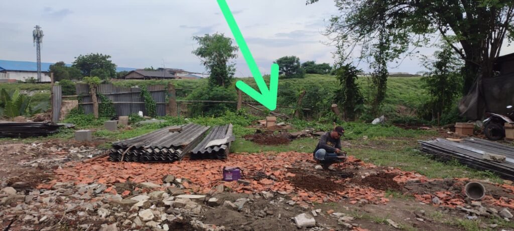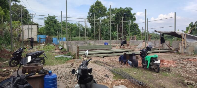 pantauan di lokasi, terlihat sebuah bangunan sedang dikerjakan dengan proses pengecoran pondasi tiang. Rangka besi baja juga tampak telah terpasang.